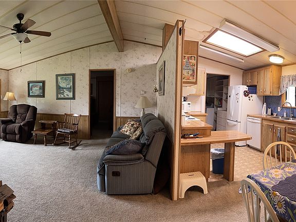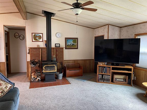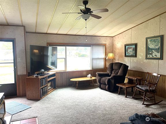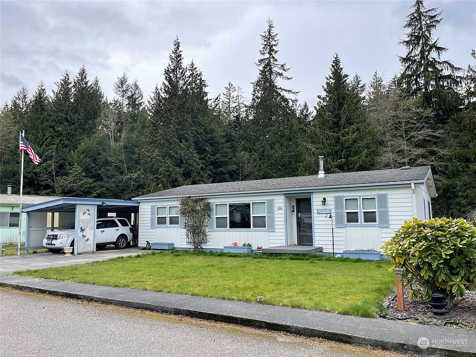 This is such a sweet, one owner home and location! The ONLY home that was installed parallel to the roadway which gives lots of room for the out buildings and back yard. Great sun/light inside and out! 2 car carport, shop and 2 bay open storage. Cozy wood stove, large windows, private and very well cared for. Furnishings stay except Primary bed and TV. Primary bedroom and bath on one end and 2 bedrooms & full bath on the other. Kitchen has lots of room and storage and dining area looks out to back yard w/ covered porch. It's so hard to find such a great home Leased land @ $520 P/M, Olympic Mobile Village takes care of septic maintenance. Carport w/storage and a great workshop a double stall overed storage. What a package to call home!