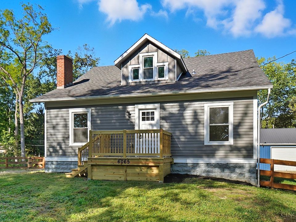 Welcome to 6065 Salem Rd, a beautifully renovated three-bedroom, two-bath bungalow on a quiet, tree-lined lane. Step onto the new front deck and into a sunlit living room with wide-plank floors, recessed lighting, and a painted-brick fireplace. The kitchen features shaker cabinetry, butcher-block counters, subway tile, and new stainless-steel appliances, including a French-door refrigerator. A stylish main-level bath serves two bedrooms; upstairs, a vaulted primary retreat boasts a double-vanity bath and a large walk-in shower. The waterproofed basement provides dry storage, laundry space, and room for hobbies. Outdoors, entertain on the back deck overlooking a fully fenced, park-like yard with a fire pit. A detached two-car garage/workshop with a metal roof offers abundant storage and hobby space, plus easy off-street parking. Fresh, neutral finishes, new HVAC, and thoughtful updates mean you can move right in. Come see it today!