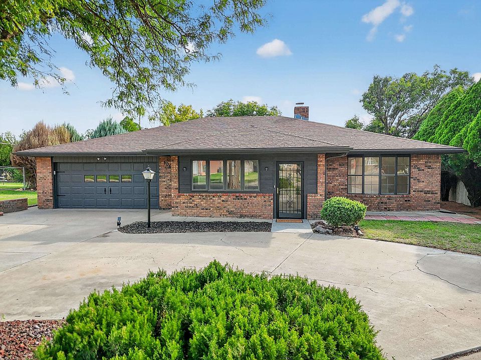 A rare find in the perfect spot. This freshly renovated home in desirable Sunset Village is wrapped in clean neutral updates with stylish modern upgrades so no DIY required! This stunning 1978 one level brick ranch style home will woo you from the moment you walk inside. Home Includes: three bedrooms, two bathrooms, an open kitchen concept with adjoining dining area and built-in hutch, separate formal dining room, office/bonus room, utility room with pantry, hall linen closet, entrance coat closet, two primary bedroom clothes closets, an attached two-car garage, plus two driveways to accommodate 4+ vehicles. Additionally, there is an enclosed front porch and enclosed rear sunroom for relaxation or added entertaining space. Features include a cozy brick fireplace in the living room centered between 2 built-in bookcases with ample storage all surrounded by stunning walnut hardwood flooring. The rest of the home includes kid/pet/spill proof LVP flooring for easy maintenance. The marble bath vanities, new kitchen cabinetry with soft-close cabinets and under counter lighting, new appliances, stylish light fixtures and fans adorned in matte black and champagne gold hardware makes this home sparkle! The sunroom opens to a fully fenced tree lined backyard with undeveloped privacy space as your western neighbor and retreat. Additionally, there is a workshop with electricity for hobbies plus a yard tool shed. The .23 acre lot includes a 6-zone inground sprinkler system for ease of yard maintenance. The property is near Sunset Hills Golf Course, Sunset Lake, Guymon Airport, and Golden Mesa Casino. This gem is waiting for its next family to enjoy life and move right in. Note: The sunroom currently has gas heat and is scheduled to have a new Heat and AC Mini Split installed with the right offer. *Disclosure: This property is owned by the Listing Broker*