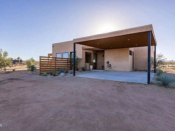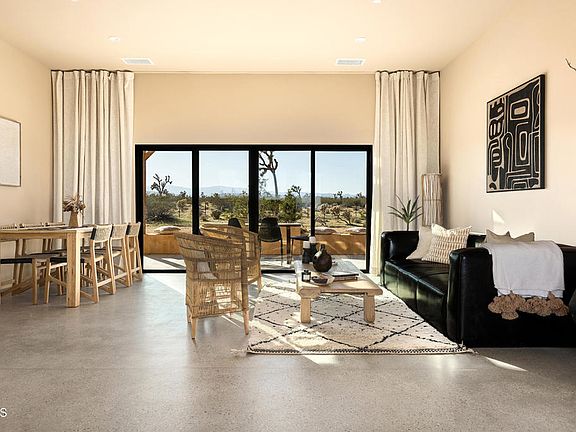 Experience elevated desert living in this new modern retreat set on over two acres in Northern Joshua Tree. Designed to frame sweeping sunset views of the San Gorgonio Mountains, this 3-bedroom, 2-bathroom home blends contemporary style with natural tranquility. Exposed aggregate concrete floors, high ceilings, and expansive sliding doors connect the light-filled interiors to the desert landscape, while the chef's kitchen impresses with Bosch appliances, a waterfall island, custom range hood, pot filler, and designer lighting. The great room separates the guest wing from the primary suite for added privacy, and each bedroom opens directly outdoors for effortless indoor-outdoor living. The primary suite offers a spa-like bathroom with floor-to-ceiling tile, skylights, and an additional outdoor soaking tub and shower for stargazing. The expansive back patio offers a space to gather around the built-in firepit or relax in the hot tub surrounded by panoramic desert views. Fully electric and energy-efficient, the home includes owned solar, central HVAC, an EV charger, and dark-sky-friendly lighting. The two-car carport can double as shaded outdoor space, while drought-tolerant landscaping with olive trees and creosotes enhances the peaceful setting. Near local favorites like La Copine, Crossroads, and Pappy & Harriet's, this thoughtfully crafted home truly captures the spirit of modern desert living.