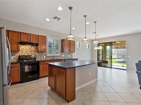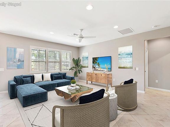 WATER and SUNRISE VIEW - Enjoy serene views of the lake from the comfort of your EXTENDED LANAI. An added feature is a patio outside the lanai and is perfect to put your chairs and watch the breathtaking SUNRISES. This house is located in the highly sought-after 55+ Del Webb Naples community, featuring the popular ABBEYVILLE floor plan with 2 bedrooms, 2 full baths and den. Upgrades include RECENTLY PAINTED interior walls throughout the home and PLANTATION SHUTTERS on all the windows. A RETRACTABLE SCREEN on the front door will allow you to let in fresh air year round. You will be able to welcome lots of friends and family with the EXTRA LONG DRIVEWAY. The PRIMARY SUITE features a bathroom equipped with double sinks, vanity seating, and a shower enclosure. A versatile DEN provides ample space for visitors, a home office, or personal hobbies. The laundry room offers AMPLE STORAGE with cabinets, extra shelving, a stationary tub, and a washer/dryer. Ceiling fans and recessed lighting enhance the home’s inviting atmosphere. The GARAGE includes extra overhead storage. Golf enthusiasts will be thrilled to know there are AVAILABLE GOLF MEMBERSHIPS at the Panther Run Golf Club, offering an exceptional golfing experience. Experience the Del Webb Active Adult lifestyle with access to a range of amenities, including the Rusty Putter Restaurant, a RESORT-STYLE pool, lap pool, fitness center, PICKLEBALL, bocce and tennis courts, a GOLF SIMULATOR, and billiards. Explore Del Webb Naples and Ave Maria effortlessly in your golf cart, whether you're heading to Publix, church, or out for a delightful dinner. Embrace the lifestyle you deserve in this extraordinary home, where comfort, luxury, and convenience seamlessly come together.