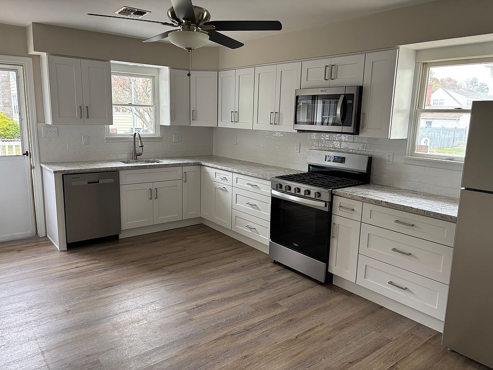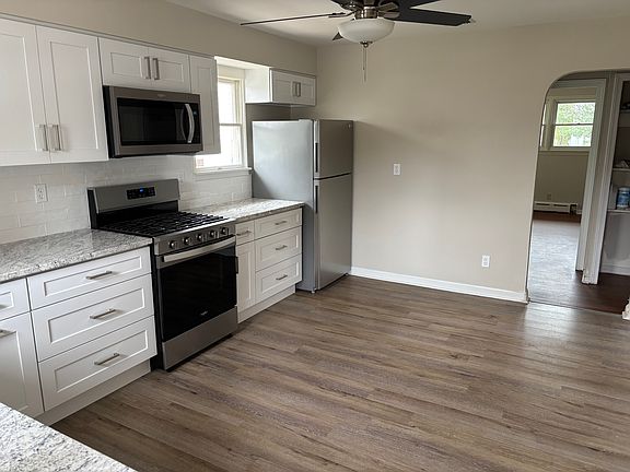 3 bedroom ranch. Central Air, Baseboard hot water heat. small stackable washer and dryer. With New Kitchen, 1 New Bath, back yard deck. 3 sided fenced in yard. Long driveway. fits 4 cars.