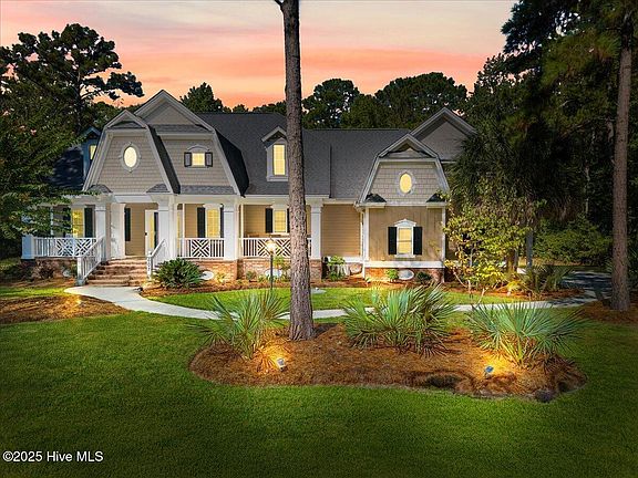 Stunning Coastal Cape Style Home in Seawatch at Sunset Harbor - 607 Carvalho Terrace SE, Bolivia, NC. Discover the perfect blend of coastal elegance & tranquil living in Brunswick County's hidden jewel—the private, gated, waterfront community of Seawatch at Sunset Harbor. Nestled away from the hustle & bustle, this stunning Coastal Cape style home offers the serenity of nature while remaining just 9 miles from the nearest hospital—making it an ideal choice for a relaxed coastal retirement or peaceful retreat. Attention to detail & quality craftsmanship are immediately evident throughout this masterfully built home. A charming covered front entry, double dormers, decorative windows & playful porch railing create timeless curb appeal. Inside, the open great room welcomes you w/ a cozy fireplace, dining area & spacious kitchen island—perfect for gatherings. A built-in oven & gas range make this a chef's dream. The primary suite, conveniently located on the main level for easy single-level living, features a tray ceiling, oversized windows & a spa-inspired bath w/an expansive walk-in tile shower, double vanity & large walk-in closet. Upstairs, 2 spacious guest rooms each offer private baths, while a versatile 4th BR above the 2.5-car garage—complete w/ full bath & private staircase—can serve as a media room, fitness space or private guest retreat. A dedicated office w/ custom built-ins provides a quiet workspace at home.