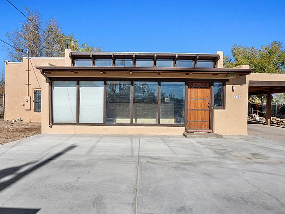 SOUTHWESTERN CLASSIC in the heart of Albuquerque's North Valley. Cozy charm meets New Mexico design in this 3-bedroom, 2-bathroom home. A gorgeous adobe wall and cactus-lined gate welcome you into this lovely valley retreat. Inside, brick floors flow through the main spaces, while carpets and laminate floors create warmth in the bedrooms. The primary suite boasts a walk-in closet, tiled bathroom, and a pitched metal roof that adds character. Stay comfortable year-round with mini splits in every room. The wood-burning fireplace and unique Trombe Wall in the front room harness the sun's warmth for eco-friendly heating. Rustic wood cabinets and beam ceilings bring timeless character, while a large fenced backyard with a covered porch invites a variety of outdoor possibilities! Call ASAP!