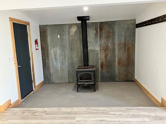 - Description: Entry room from back of house has wood stove and concrete floor. It is open to the living room.