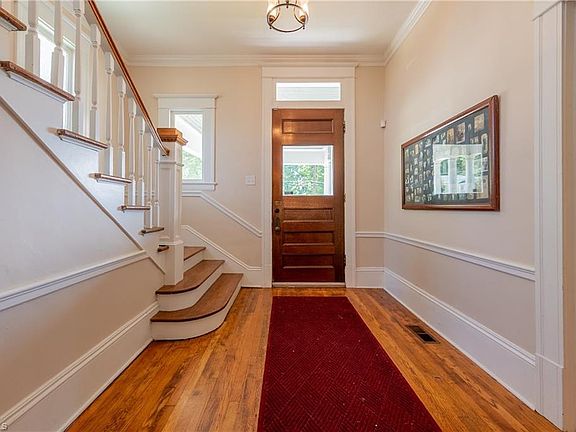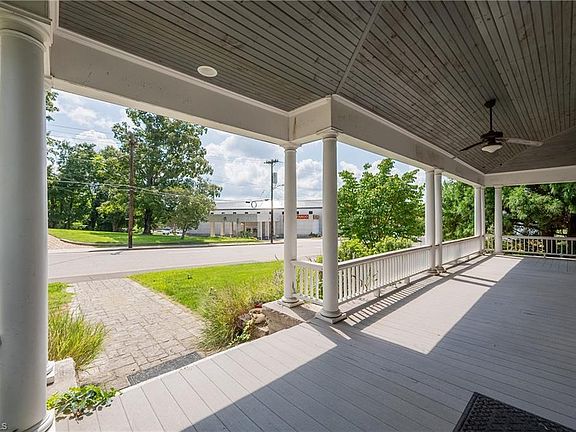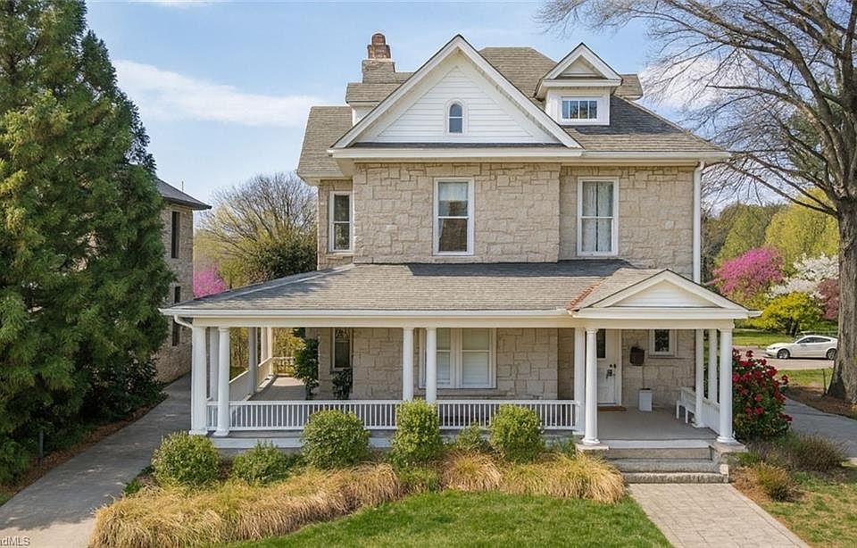 One of Mount Airy’s most unique historic homes for sale, this move-in ready property sits on 1.32 gated acres in the heart of downtown. Features include a wraparound porch, hardwood floors, soaring ceilings, and intricate woodwork. The primary bedroom on main offers easy single-story living, with guest bedrooms upstairs and a finished 3rd-floor bonus room for an office, art studio, or retreat. Custom kitchen with granite countertops, upgraded appliances, and handcrafted cabinetry. Cozy sunroom with wood ceilings and granite accents overlooks landscaped gardens. Outside, a winding path leads to a detached two-car garage, storage building, and covered pavilion with exposed beams. The backyard features mature landscaping, a pond, greenhouse, and RV parking. Timeless character meets modern comfort—ideal for buyers seeking homes with land, gardens, or outdoor entertaining space in Mount Airy NC.