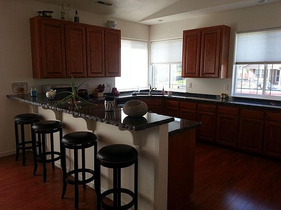 Quality built like new home in nice Eagle Point neighborhood. Spacious & open floor plan with vaulted great room, custom gas log fireplace, beautiful laminate floors, large dining area, gorgeous custom hardwood kitchen w/walk-in pantry, solid granite counters w/custom edge, stainless steel appliances, 4-6 seat breakfast bar, lots of counter & storage space, leaded glass entry door, 9'+ ceilings, gas forced air $ water heater w/re-circulation system. Vaulted master suite w/patio access, large walk-in closet & extra storage cabinets. Fantastic 15' x 26' covered patio w/lighting, private fully fenced & landscaped backyard, storage shed, huge fenced/gate 11.5' x 75' RV parking area and large finished garage.