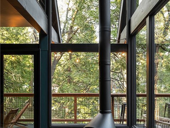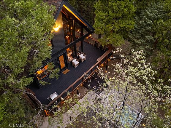 Moody, Modern, and the Cabin in the Woods You’ve Been Waiting For! Surrounded by pines and wrapped in glass, this fully renovated mountain retreat is one of To Dwell Here’s top performing short term rentals, named by GQ as one of the Top 18 Cabins in the U.S. Offered fully turnkey with lake rights included and a strong rental history in place. From the moment you walk through the door, you’re greeted by a dramatic wall of glass that brings the outdoors in. The main living space includes the kitchen, dining area, and living room, all surrounded by windows with an open layout and a cozy freestanding fireplace that anchors the space. Two bedrooms and a full bath complete the main floor. Upstairs, the wall of glass continues, bringing light and forest views into the loft. Vaulted wood-beamed ceilings make the space feel open and inviting, with a second living area, third bedroom, and full bath that offer flexibility for guests or everyday use. Step outside to the wraparound deck, where you can take in the mountain air, cozy up by the fire, or grill beneath the trees. Just below, a private concrete patio with a hot tub sits under string lights, perfect for soaking under the stars. A seasonal stream runs through the property, adding to the sense of escape. The home also includes central AC for summer comfort and a whole-house generator for winter reliability. Located on a county maintained road and just minutes from Lake Arrowhead Village, the lake, and the golf course. Fully dialed in, surrounded by trees, and ready for its next chapter. This is mountain living exactly how it should be.