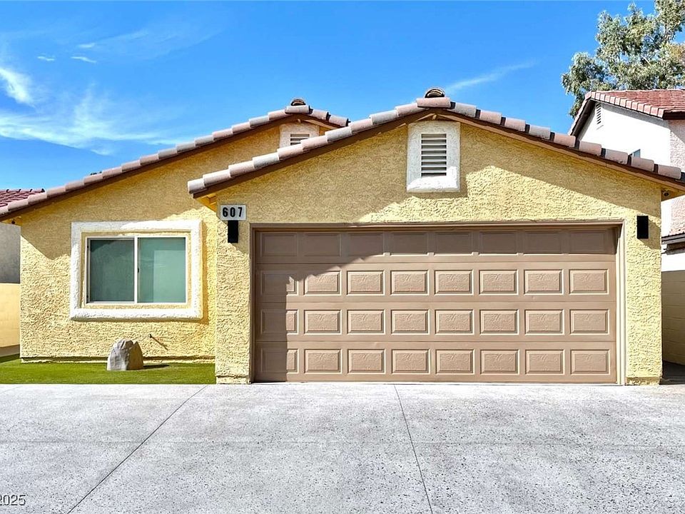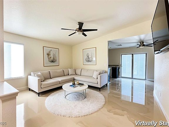 Discover this fully renovated single-story home in one of Henderson’s top school zones. Modern luxury meets energy efficiency and low-maintenance living throughout. A must see! Features include seamless epoxy floors, new 6-panel doors, built-in closet shelving, and ceiling fans with adjustable LED lighting. Bathrooms feature Grohe rain and handheld showers, tempered glass doors, floor-to-ceiling tile, LED anti-fog mirrors, and barn-style sliding doors. Low-E windows/doors, leased solar panels, new attic insulation, R-8 ductwork, and a 50-gal gas water heater with AO Smith filtration. New roof, fascia, plywood perimeter, and high-gloss painted block walls. Outdoor artificial turf, gas fire pit, black glass concrete driveway & patio, plus water and gas hookups.