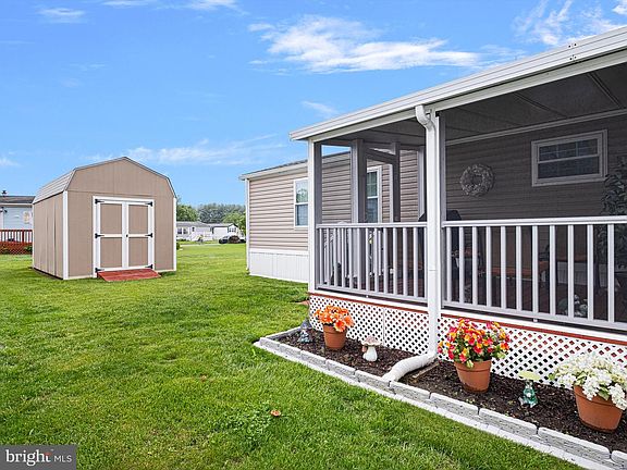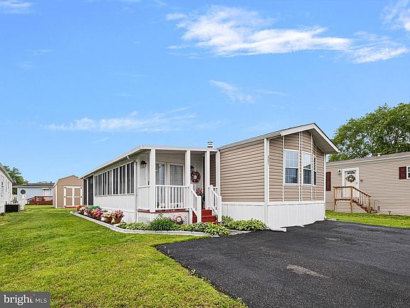 A winner of a home in Waterford Estates! Located in scenic countryside of Bear in quiet enclave off Salem Church Rd. is this top-to-bottom renovated tan/white siding, 2 BRs/2 full bath 1-level-living mobile home that is spacious, sunlit, and striking! Triple width parking pad sits before paver sidewalk that leads to elevated white railed covered front porch dotted with potted plants and flanked by landscaped beds. Home upgrades include all-new (2022) interior including new HVAC, cabinets, windows, flooring, appliances, bathrooms and more! Step through glass door into sprawling, lovely tile- floored sunroom (optional screens) with built-in bookcase and series of windows lining side wall allowing natural light to stream into room. With cozy seating throughout, it’s the perfect perch for morning coffee, afternoon reading and evening relaxing! At far end of room glass sliders lead out to sizable screened-in sun porch, where one can enjoy sights and sounds of nature. From sunroom go up 2 steps through natural wood trim French doors and you’re greeted with charming interior and fluid floor plan, where rooms effortlessly blend into one another. FR is open, warm, and inviting with gray washed floors and dual window on back wall. Collection of couch, chairs and coffee table create easy intentional style as well as comfortable niche for everyday living and easy entertaining. A gathering spot for weekday TV shows, weekend games and everything in between! Beyond FR is on-trend eat-in kitchen. Appreciate pristine white cabinets accented with black bar hardware, sleek SS appliances perfectly paired with black/white/gray countertops and glass frosted pane above half wall and dramatic B & W hexagon shaped tile backsplash elevate the elegance. Breakfast area is defined by dining set, pantry, and black matte chandelier as well as set of extra cabinets/drawers/countertops offering bonus storage, additional prep space and built-in coffee bar! Beyond kitchen is hall that leads past tucked-in laundry room with W & D/cabinets, self-standing floor-to-ceiling cabinet and side door that accesses yard. Primary suite is impressive! Sweeping BR offers generous wall for full-height furnishings such as armoire along with ample room for queen bed, vanity set, and end tables. Walk-in closet is big enough to stash seasonal wardrobes and accessories for 2! Gorgeous double glass doors grant access into stylish primary bath. Here flooring subtly shifts to angled gray/cream tile, while dual sink white cabinet vanity with black bar hardware and B & W backsplash is echoed from kitchen to create soothing continuity. Opposite side of home, designed to provide privacy, is spacious secondary bath/BR. Guest/secondary bath features convenient tub/shower combination and dual-door cabinet vanity. Just past is well- designed large secondary BR with beautiful showpiece bow window, alcove ideal for quaint desk area and DD closet/ceiling fan. Back yard is flat and lush with gem dual-door substantial shed, ideal for outdoor furniture, seasonal items, and gardening tools! Lot rent includes water, sewer, trash, recycling, and basic cable. Community boasts BB field, roller hockey, BB/tennis courts, 2.5-mile walk/run path and 4 playgrounds. Community is a turn away from Pulaski Hwy., 1 mile from Becks Wood creek, 2 miles from Glasgow State Park, nearby to both Peoples Plaza and Fox Run shopping centers, close to YMCA, 15 mins. from Lums Pond, and less than 20 mins. from Newark/Wilm. Home sweet home on Huckleberry Ave.!