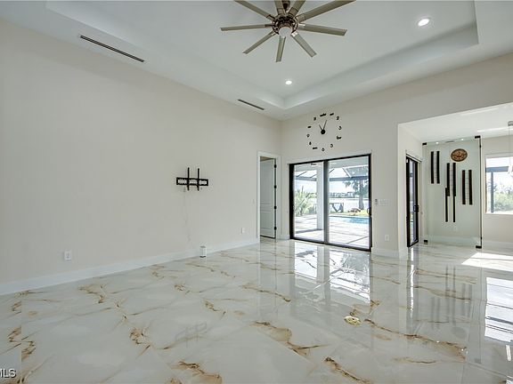 Motivated Seller!!! & will contribute towards buyer closing costs. Discover modern coastal living in this new construction 3-bedroom +Den, 3-bathroom home located in the SW Cape, adjacent to Pine Island corridor. This residence showcases an array of unique upgrades that set it apart. The 8-foot double doors at the entrance add an elegant touch, as you step into the house you will appreciate the attention to details and the volume ceilings equipped with a 72" fan giving it a grand view right as you arrive. Natural light floods into this house to highlight the open concept design. The kitchen features: Quartz waterfall tops eat-in Island kitchen is ready for the chef inside of you to shine or have a sit-down meal in the dining area equipped with a frameless glass wine cabinet. All the finishes in this home were used with style in mind, from the quartz countertops and large format porcelain tile floors to the soft-close Euro box cabinets and extra-high tray ceilings. The primary suite features expansive room, with walk-in closet and open display for your purse, or shoe collection, dual sink vanity and frameless glass shower enclosure with body sprayer and rain fall head. The Junior suite offers ample room and a full bath that doubles as a pool bath. The 3rd bedroom has cabinets in the closet and plenty of room for growing family, meanwhile the Den offers a great space for an office or media room. Now, take in the sun and unwind in the heated saltwater pool, featuring deck jets and ledge lounger, promising endless relaxation. The covered patio with wood accent ceiling, comes complete with an outdoor shower and a summer kitchen new ice maker, cooktop and sink ready for the cookouts and memories. Take in the breathtaking views of the lake where you can enjoy the sunrise and launch your kayaks or go fishing in your back yard. 3 car garage has been finished with epoxy garage floors, electric car charger and is ready for the toys to be stored in comfort. This property is nestled on a serene street in a prime location; this exquisite home is ready for you to experience the best of Florida living! Don't miss your chance to call this remarkable property your own. Close to Schools, Shopping on Pine Island Rd. and so many more amenities and restaurants.
