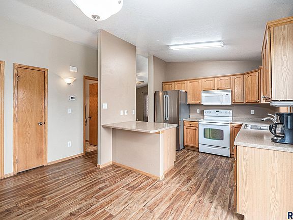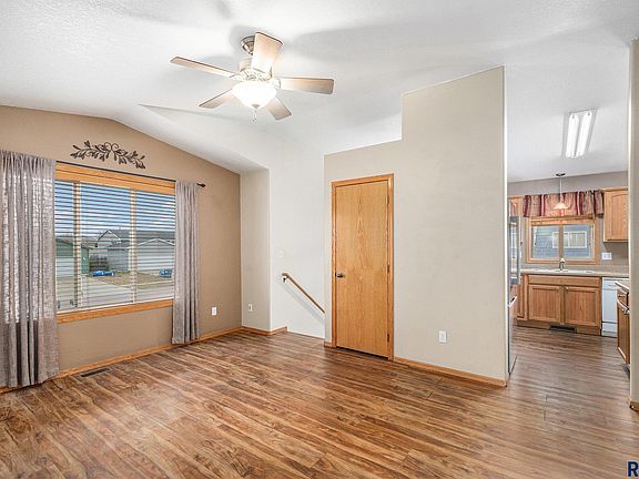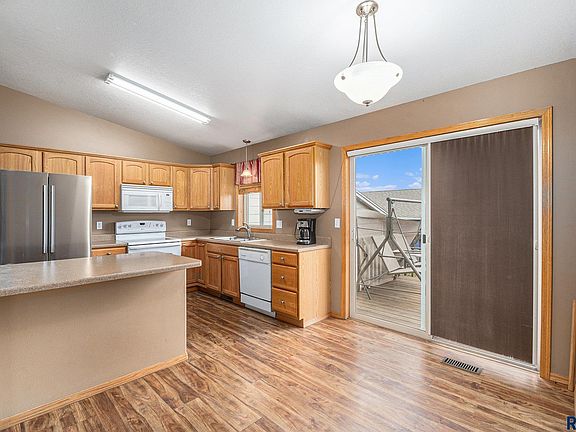 Welcome to this well-maintained split-level walk-out home offering 3 bedrooms, 2 full bathrooms, and a 2-stall attached garage. Situated on a mature city lot with established trees and landscaping, this property combines great curb appeal with comfortable, functional living spaces both inside and out. The privacy-fenced backyard features a 12x8 storage shed and multiple outdoor areas designed for relaxation and entertaining. Enjoy outdoor living with a spacious deck and large patio complete with a pergola and firepit. Inside, the main level offers a bright, open living room with vaulted ceilings, a large picture window for abundant natural light, and pre-wired surround sound. The dining area also features vaulted ceilings and sliding doors to the deck. The kitchen includes ample cabinetry, a breakfast bar, and an open layout ideal for both everyday living and entertaining. The primary bedroom is generously sized with a double closet, while the second main-floor bedroom also includes a double closet. The lower level features a spacious family room with pre-wired surround sound and sliding door to the backyard, third bedroom with a walk-in closet and a full bathroom.