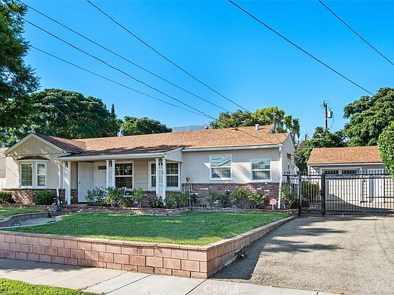 Charming North Monrovia, 3 bed 2 bath single story home with a large front porch and a huge back yard. The garage and workshop are detached off a long driveway with an automated gate. Inside, this nicely updated home has newer flooring, paint, kitchen updates and remodeled baths. The living room is large and opens to 2 bedrooms with a Jack and Jill bath. Off the dining room is the primary suite with bath and large walk in closet. The kitchen has quartz counters, stainless appliances and opens to the attached laundry area. Step down to the family room with fireplace and built-ins. Walk out to a big covered patio, perfect for entertaining. Speaking of perfect, the backyard is large, private and flat, ideal for an ADU or pool! You will love the old fashion street lights, huge trees and for you gardeners, there are raised beds. This home is move in ready. It's light and bright with newer windows, recessed lighting, central air and recent water heater. The neighborhood has wonderful character and beautiful mountain views. Don't miss this home!