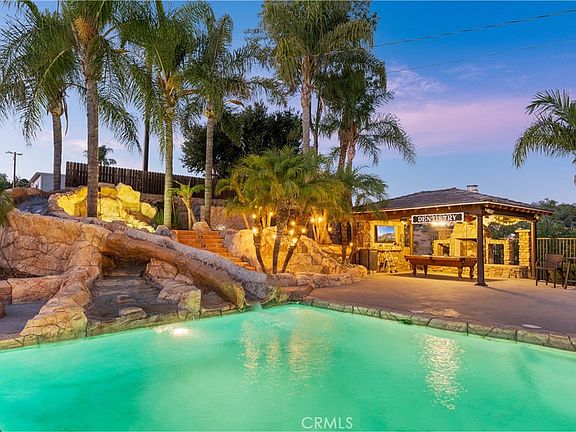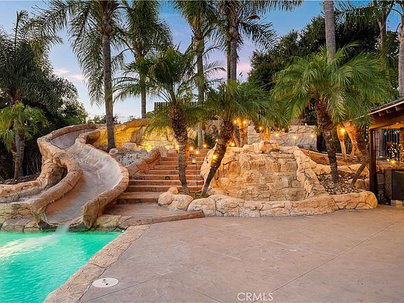 The resort-inspired backyard is an entertainer’s dream, featuring a pool, spa, and water slide, a built-in BBQ island, and inviting outdoor seating areas. The front yard showcases a manicured lawn and fountain, while the side yard includes a horse stable, blending functionality and charm.