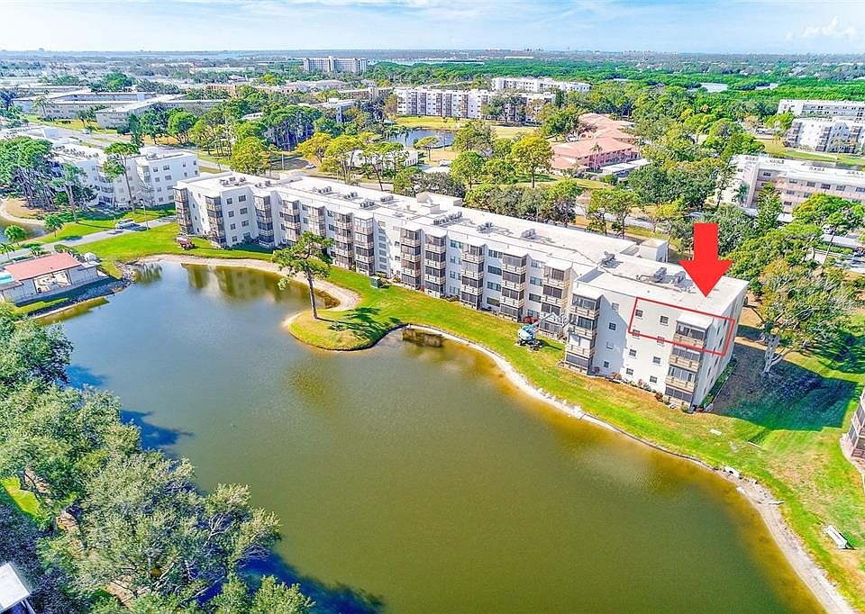 Welcome to this RARE TOP-FLOOR corner condo with spectacular water views in the desirable 55+ community of Terrace Park at Five Towns. This penthouse 4th-floor end unit offers 2-bedroom, 2-baths with 1,340 sq ft, an abundance of natural light, and breathtaking sunrise views overlooking the peaceful pond from your private screened-in balcony. Inside, you'll find a spacious split floor plan with an open living and dining area perfect for everyday comfort or hosting guests. The tastefully updated kitchen features Corian countertops, stainless steel appliances, updated cabinetry, a beautiful backsplash, and a window perfectly positioned to enjoy the water view—even while doing dishes. A large laundry/utility room off the kitchen provides full-size washer/dryer, extra storage, and space that could easily serve as a hobby nook or small office. The generous primary suite includes a walk-in closet and an en-suite bathroom with a tiled walk-in shower. The guest bedroom is ideal for visitors or a dedicated office space. Additional highlights include a building elevator, one assigned covered parking space, ample guest parking, and a dedicated storage space. The Newport building has just been freshly painted (November 2025) and a new ROOF installed (2024). The monthly association fee covers cable, internet, water, sewer, trash, gas, exterior building maintenance, and full access to the incredible amenities of Five Towns. This resort-style community spans over 144 acres and offers 6 pools, hot tubs, walking paths, grilling areas, tennis and bocce ball courts, shuffleboard, two clubhouses, fitness centers, billiards, card rooms, a library, and countless social clubs and planned activities. A new RV/boat/vehicle parking lot is nearly complete, with spaces available for lease. Conveniently located near shopping, restaurants, medical facilities, award-winning Gulf beaches, and just 25 minutes to Tampa International Airport—this home is perfect for seasonal or year-round living. Experience the best of active Florida living-schedule your private showing today!