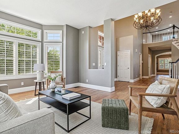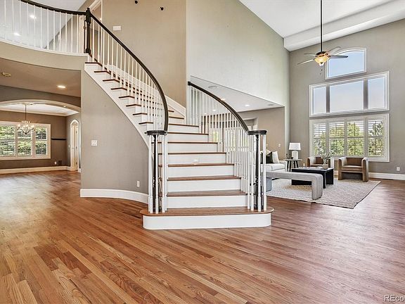 Discover elegance as you enter a home adorned with a sweeping staircase, vaulted ceilings, and designer finishes at every turn. This open layout masterpiece is ideally situated next to Daniels Park, offering endless trails for outdoor enthusiasts. Recent remodeling has transformed the kitchen and master bathroom into showcases of contemporary design. The kitchen boasts quartz countertops, a Café line Advantium French door oven, a gas cooktop, stylish backsplash and lighting, and a new refrigerator and dishwasher. The master bathroom features updated tile and countertops. A whole-house sound system enhances the ambiance. The wood floors on the main level were refinished, and beautiful new hardwood floors were added throughout the second floor, up the main staircase, throughout the basement, and down the basement staircase. The main floor presents a harmonious blend of functionality and elegance. A dedicated home office provides a quiet workspace, while a formal living room and dining room offer sophisticated gathering areas. The kitchen seamlessly flows into the family room, creating an inviting space for relaxation and connection. Step outside onto the back deck to extend your living area and embrace outdoor living. Entertainment finds its haven in the basement, complete with a soundproof in-home theater. Adjacent is a lower-level kitchen featuring a full-size refrigerator, dishwasher, microwave, and sink. HVAC updates include a new two-zone AC system for the second floor and a new water heater. The home rests on an expansive, level lot, over 1/3 of an acre, graced by 20-year-old trees, ensuring privacy. This remarkable residence harmonizes luxury, technology, and nature's beauty.