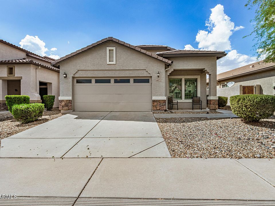 Home, sweet home! This lovely 3-bedroom residence features a 2-car garage, stone accents, and an inviting front patio. Discover a serene living room with high ceilings, a soothing palette, blinds, and durable tile flooring. The well-appointed family room is perfect for relaxing evenings with loved ones. Cook delicious meals in the gourmet kitchen, equipped with ample wood cabinetry, recessed lighting, built-in appliances, a pantry, and an island with a breakfast bar. You'll also find a cozy den with soft carpeting, perfect for an office or lounge. The main bedroom includes a built-in closet with mirrored doors and a private bathroom with double sinks. Unwind at the end of a long day in the backyard, which offers a covered patio and abundant space to craft your dream oasis. Make it yours!