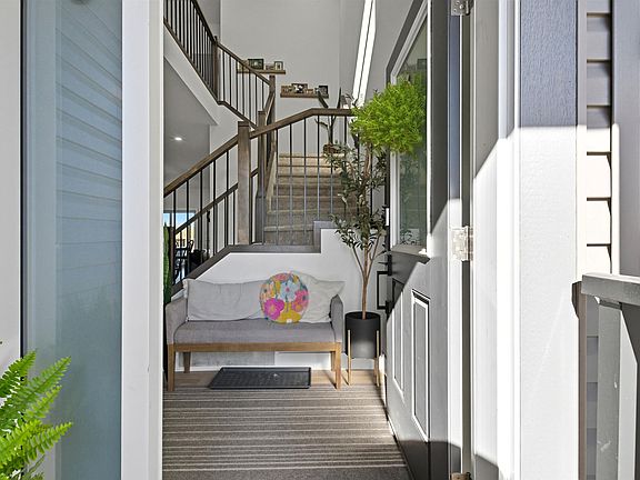 Gourmet kitchenWood-toned islandStainless appliancesSoaring open-to-below entryWood railingsStand-alone tubGlass shower