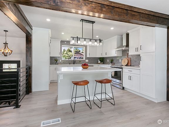 Masterfully remodeled with high-end fixtures and finishes. Impressive custom beams throughout. Two primary suites: one on the upper level with en-suite 3/4 bath and access to back deck; second on the lower level with amazing custom bathroom. Wet bar with wine fridge in lower level. Huge 1/3-acre lot begging for your landscaping touches. Peek-a-boo views of Mt. Baker from the TWO back decks. Minutes to schools and downtown Ferndale. The new Thornton St overpass will make accessing I-5 a breeze! Lower level has separate access, perfect for an MIL set up or rental. This home offers you many living arrangements and ample parking. Outside, there is room for a large shop and all of your toys. Don't miss this incredible opportunity.