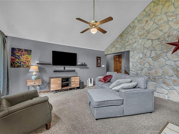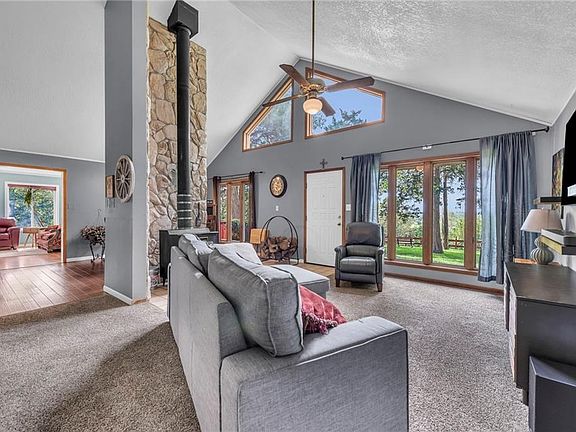 Inside you’ll find an expansive living room with soaring ceilings and a stunning stone accent wall. The wood burning stove adds warmth and a cozy feel to the space. The kitchen and dining spaces flow effortlessly and are ready for your personal touch. Cooking is easy with gorgeous cabinets and ample space for storage.
