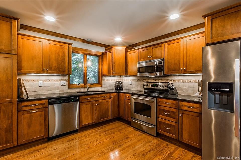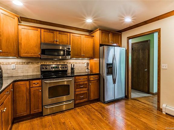 Spacious 3 bedroom, 2.1 bath raised ranch features fireplaced living room with vaulted ceiling and skylights to allow tons of natural light, hardwood floors, kitchen fully renovated with granite counters, stainless appliances, and hardwood carried through to match, breakfast bar overlooks the dining room with slider that leads to the oversized wrap around deck, and perfect for entertaining! All 3 bedrooms are great size, master has a full updated bath with granite vanity and tile floor, finished lower level with additional fireplace, roof is 3 years old, new garage doors, panel upgraded, whole house surge protector, generator hookup, and electric car charger, and more! Conveniently located between I-84 and I-384 for all your travel needs! As well as being close to Valley Falls and Bolton Lake for all you nature lovers. Rails for Trails is close also!