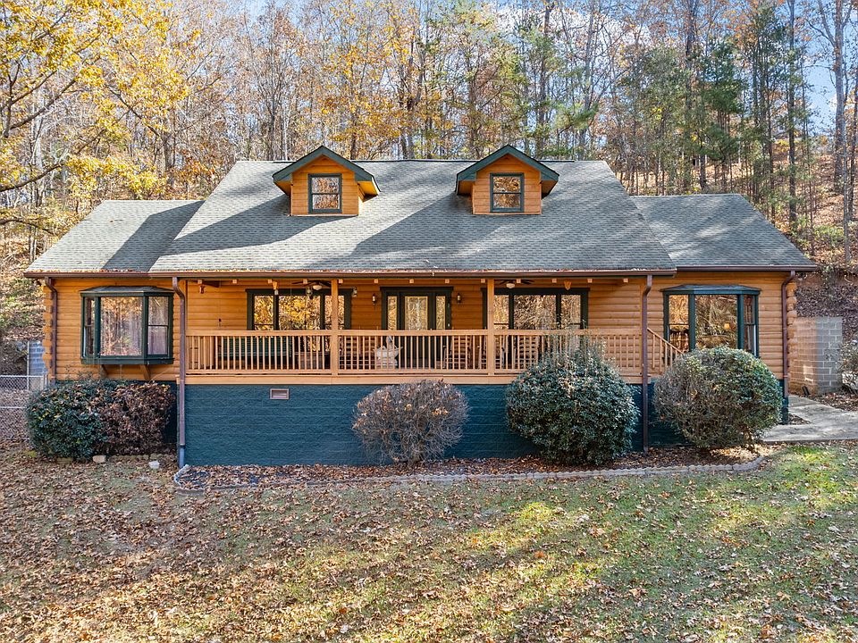 Log cabinAuthentic tennessee mountain woodMain-level primary bedroomHardwood floorsRocking-chair front porchBeautiful natural lightFresh exterior paint