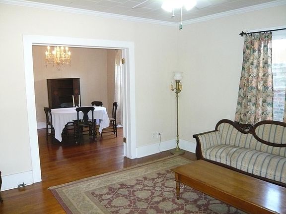 Quaint 1930's Downtown bungalow, 2BD/1BA. Lots of open bright space 1296 SF! Living Room opens to Dining Room through French doors,2 Bedrooms, Kitchen & Sunroom(that could be used as a third bedroom &/or office) have 12' ceilings. Long leaf pine floors throughout. Bathroom has claw foot tub w/ shower attachment. Classic 30's built in cabinetry in kitchen. Very sweet front porch, complete w/ porch swing. Nice, large back yard with brick patio. Off Street parking for 3 vehicles. This house could easily be used as a home office (it's commercially zoned). Central HVAC. Whirlpool stackable front loader washer & dryer.