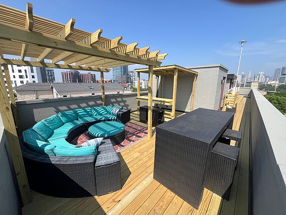 Experience living in the perfect Chicago location in this 2-bedroom,2-bathroom Condo on May Street with the best PRIVATE ROOFDECK in River West! This spacious unit boasts a contemporary aesthetic in this newer construction building, with a stunning chefs kitchen featuring stainless steel appliances and a generously sized granite island with breakfast bar and hardwood throughout. Walking distance to shopping and dining of downtown, West Loop, River West and West town / Wicker Park. Unmatched views of downtown! 1 Garage Parking space available for $200. Apartment also features: Large living are with breathtaking downtown views and fireplace, 2 large Equal sized bedrooms one with en suite bathroom, large closets, It has a nice large island and dining area. Bathrooms are redone. 3 distinct Outdoor spaces include a private rear deck, a brand new private roof deck with pergola and built in kitchen, and a massive shared roofdeck with insane views over downtown- dont miss it on your tour!! Laundry in unit, dishwasher, central heat and air, garage parking space for $200 per month. Close to everything- Blue line, green line, Grand or Chicago Bus. I-90/ 94 and I-290. Apartment is available for 8/1 move in only. No Smoking, Lease to begin 8/1 only. 1 year lease or 1.5 year lease available (to end 3/31 or 4/30/26). Garage parking $200 extra