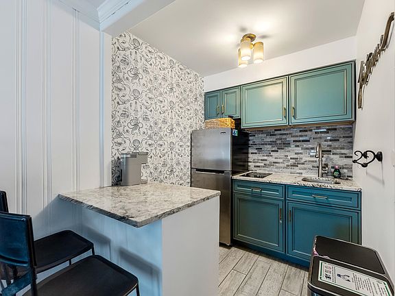 Gorgeous beachy aqua cabinetryFull size sleeper sofaBeautiful granite center islandMatching countertops