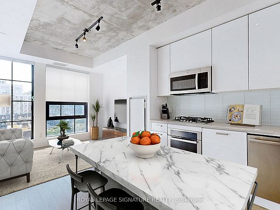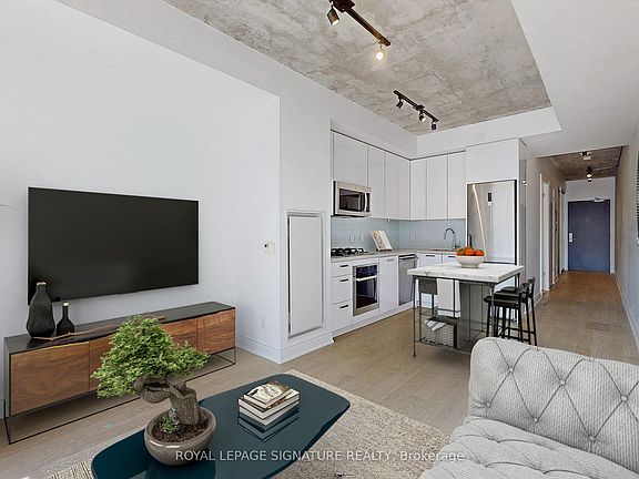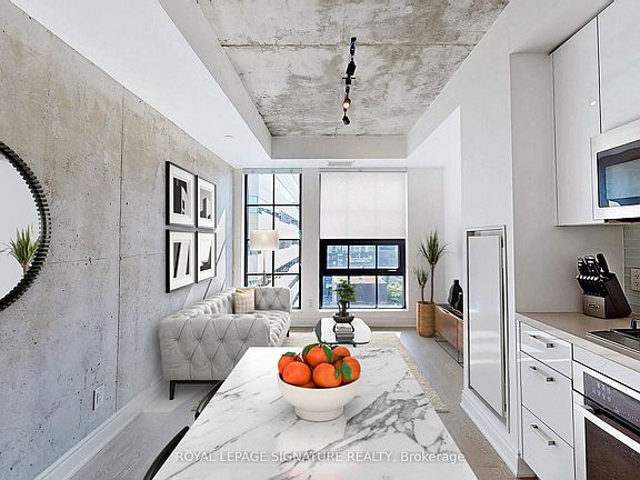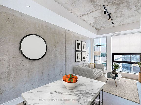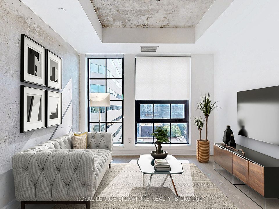 Gorgeous Harlowe Building! Modern, stylish, and full of character! This south-facing suite features floor-to-ceiling windows that flood the space with natural light. The 10th floor is one of the few in the building with 10-foot ceilings and an unobstructed south view. Enjoy stunning loft-style architecture with exposed concrete ceilings, feature walls, and hardwood floors throughout. The functional layout offers a defined living area, perfect for relaxing or entertaining. Located steps from King and Queen Street West, you're surrounded by trendy shops, grocery stores, restaurants, bars, cafes, and convenient transit options. Building amenities include a concierge, party room, gym, and more.