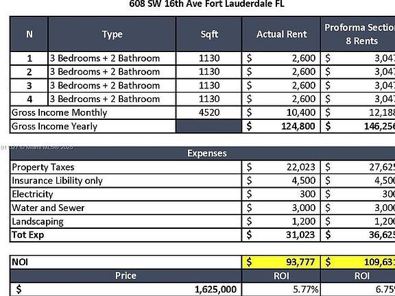 This building is perfect for section 8. Section pays for this Zip code $3,047. That brings in $146K gross and about $115K Net. It consist of four units of 3 bedrooms 2 Bathrooms of 1,200 SF each. Two closets of laundry. 6 parking spaces total. Freshly painted . Impact windows. CAP of 7%.