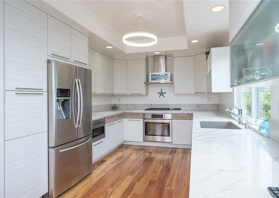 Enjoy ocean breezes in this Beautiful, Bright, Updated, Spacious Ocean View Home which features 3 balconies, a rooftop deck, 2 fireplaces, A/C, a private backyard & bonus rooms. Imagine coming home on this tree lined street in the coveted South Redondo community and opening your front door to see high ceilings, a sweeping staircase and Brazilian oak flooring. The entry level has three bedrooms and two bathrooms. The large primary retreat boasts a balcony, walk-in closet, a fireplace and an ensuite spa bathroom with double sinks and a separate water closet. Up the spiral staircase is a light-filled living room with vaulted wood ceilings, a fireplace, a formal dining/bonus room, plus another dining room and a gourmet kitchen. The tasteful updated kitchen has custom European style cabinets, Quartz counters and stainless steel appliances which are included. The views continue from the inside to outside on the deck. Enjoy your coffee, wine or BBQ on your deck and ascend the spiral stairs to a rooftop deck to take in a sunset, ocean and Palos Verdes views and holiday fireworks. Back down on the garage level you'll discover another bathroom, a separate laundry room, and two additional rooms. One room leads out to a private yard. The rooms can be set up as a bedroom or office and the other as a den or family room or use both rooms as separate living quarters for family members. This Dream Home is so close to the Beach, Good Eats, Shopping, The Riviera Village & Award winning Schools!