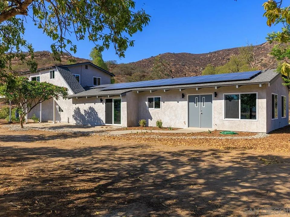 Escape from city life to your own 5 acre paradise of peace and tranquility, far enough from the hustle and bustle, yet close enough to downtown San Diego and beaches to visit. This 3 BD/ 3BA home has been painstakingly remodeled transforming it into a stunning residence with gorgeous panoramic mountain views in all directions. Walk through the front door into the large living room with vaulted ceilings and luxury vinyl laminate floors which extend through the entire home. Spacious dining area opens to the fabulous kitchen with eat-at island/ SS appliances/ quartz counters, and adjacent to an expansive family room with slider to front patio. Take in huge views across the valley to the mountains in the distance from sunrise to sunset. Two additional spare bedrooms and two full bathrooms on the main level both with refreshing material choices you will love. Head upstairs to a massive master suite with alcove for office/nursery, spa-like bath with separate soaking tub/ glass enclosed shower stall/ dual sink vanity, 8X7 walk in closet, and 2 balcony retreats boasting breathtaking north/south mountain views. Located in Dehesa/El Cajon on 5-acres with A72 zoning/ O animal designation. Tons of room for horses or other animals/ crops/ arena/ additional structures/ ADU. Private productive well/ private septic/ newer HVAC system/ new dual pane windows/ all new exterior stucco and paint/ new roof/ and Sunrun solar system lease add to the value of this energy efficient home. Options are endless in creating your own private oasis in this beautiful country setting.
