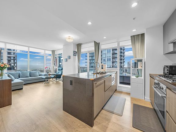 Located in the vibrant heart of Metrotown, Station Square Tower 4 by Anthem & Beedie Living defines luxury and convenience. This 2-bedroom, 2-bathroom corner residence boasts desirable Southeast and Northeast exposure, flooding the home with natural light and showcasing breathtaking views of the North Shore Mountains, Deer Lake, and city skyline. Thoughtfully designed with floor-to-ceiling windows, two spacious balconies (240 sqft), and seamless wood laminate flooring, it features a modern BOSCH kitchen with gas cooktop, built-in oven, and integrated refrigerator & dishwasher. Residents enjoy 32,000 sqft of premium amenities-a fitness centre, yoga studio, guest suite, rooftop garden with BBQ lounge, and 24-hour concierge. Steps to Metropolis, SkyTrain, and Central Park. Must See!!!