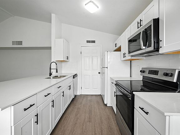 The kitchen features white shaker cabinets, new countertops, and new hardware. Both bathrooms have been renovated with new vanities, fixtures, and lighting. The main bedroom includes a double-sink vanity and a private bath.