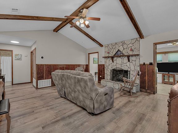 This is a beautifully RENOVATED Craftsman-style farmhouse with impressive UPGRADES, perfect for family living or those who love a peaceful, countryside lifestyle. With over $100,000 in improvements, this home has been thoughtfully updated, featuring NEW ENERGY EFFICIENT WINDOWS AND DOORS, NEW LVP FLOORING, A 2-STAGE HEAT PUMP A/C system with new ductwork, and more.The house welcomes you with a charming Southern porch ideal for relaxing with a glass of sweet tea. Inside, the home offers richly stained woodwork, vaulted and beamed ceilings, and a cozy stone fireplace. The NEW FAMILYSTYLE KITCHEN is a dream for any home chef, featuring white shaker cabinets, a stainless steel appliance suite, and expansive countertops perfect for cooking and entertaining. The spacious master bedroom can accommodate large furniture, and the newly renovated master bath includes dual vanities and a modular walk-in shower. The remaining bedrooms are generously sized, and the split floor plan ensures privacy.