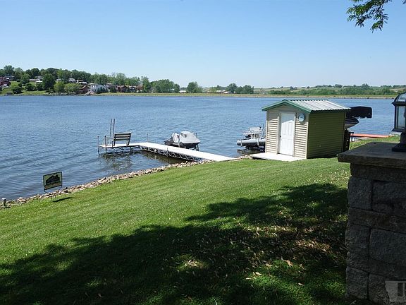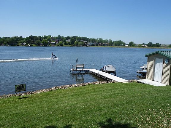 Gorgeous view from this home! 105 feet of lakefront on only one lot with 2 docks and an electric lift for pontoon boat. This is a ranch 2 bedrooms, kitchen, living room and a 4 season room currently used as a dining room on the main floor. Would also make a great office with its own private entrance. There are 2 non-conforming bedrooms in the walk-out basement. The master has half bath. The kitchen has newer (2014) stainless steel appliances. The spacious living room has a newer (2014)gas fireplace. The deck is 380 SF and has LP line to the grill. Another 3 season porch in the basement is 256 SF facing the lake and a fire pit with rock retaining wall & electric outlets was added in 2010. Basement also has a 16 x 18 garage/workshop space. New lighting, 68 fans and Levelor blinds throughout. Walking distance to the beach and community center and has the perfect view of the dam and the large part of the lake. 2 L-shaped Roll-a-Dock added in 2013 w/ bench/ladders. Most furniture negotiable