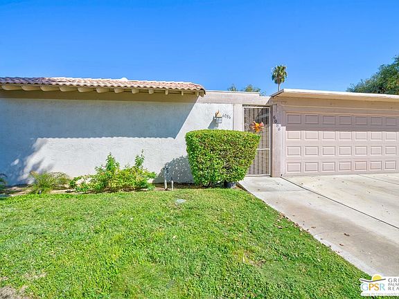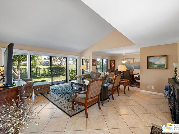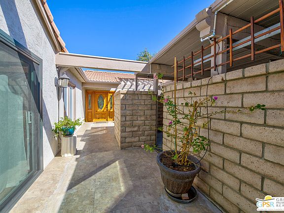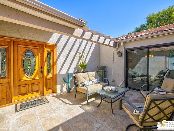 Serene 2 BR/2BA turnkey furnished home in the cozy Sandcastles community (48 units) of South Palm Springs. Situated on the Tahquitz Creek Golf Course, this interior end unit offers multiple patios and stunning views. A large, private courtyard leads you to double doors that open into a spacious living room with vaulted ceiling and sliding glass doors to the rear yard and patios. Slab granite counters in the large kitchen with a lovely breakfast nook. The primary bedroom suite opens to the courtyard and features tiled walk-in shower and double vanity. The generous guest room offers privacy with a Jack and Jill bathroom. Dual pane windows/sliders and new HVAC installed in 2023 with Nest thermostat enhance energy efficiency. A double carport with overhead door provides security for parking and storage. Community has six pools, three spas and is conveniently located close to Trader Joe's , Target and a quick drive to downtown Palm Springs. Whether full time or part time, this is the desert home you are looking for!