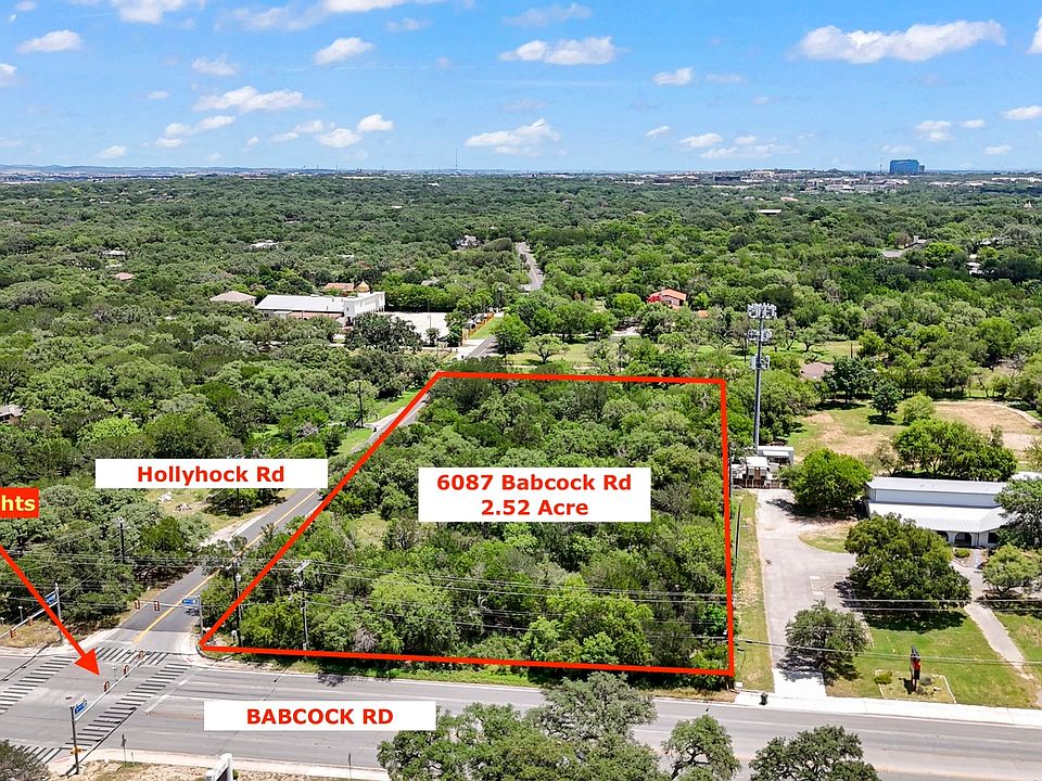 Prime 2.464-acre commercial corner lot located at Babcock Rd and Hollyhock Rd intersection (6087 Babcock Rd, San Antonio, TX 78240). Situated at a signalized intersection with high traffic counts and excellent visibility for your next development. The property offers dual access, flat topography, and utilities available. No floodplain. This location is ideal for a wide range of development opportunities subject to zoning. Surrounded by established residential neighborhoods, medical facilities, and retail centers. Minutes from Loop 410, the Medical Center, and USAA. Great opportunity for investors or developers looking for a high-traffic, corner location in a rapidly growing area.