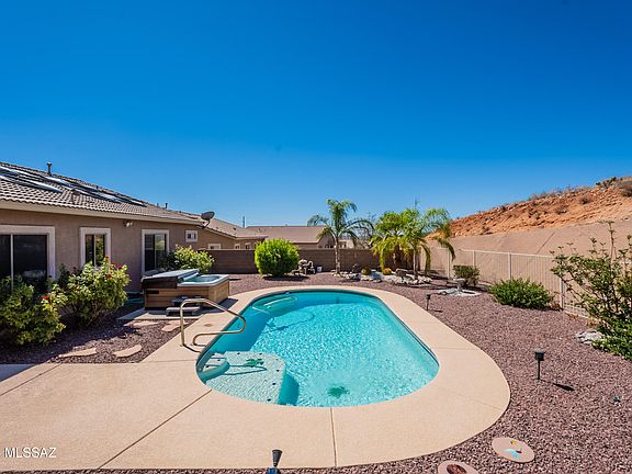 This single story home features an open concept floor plan fireplace with tile flooring throughout. The kitchen is an ideal spot to enjoy cooking with granite countertops, island, pantry, gas stove and newer dishwasher. Practical layout with split bedrooms for privacy. Large primary bedroom with a huge walk-in closet. A beautiful new walk-in shower, and dual vanity. Inside laundry room. One of the standout features is the lack of a rear neighbor, offering a sense of privacy to relax and enjoy the solar heated pool and the hot tub. Also has a Meyer lemon and apricot tree, beautiful rose bushes and palm trees create a serene and inviting atmosphere, ideal for those seeking a tranquil environment.