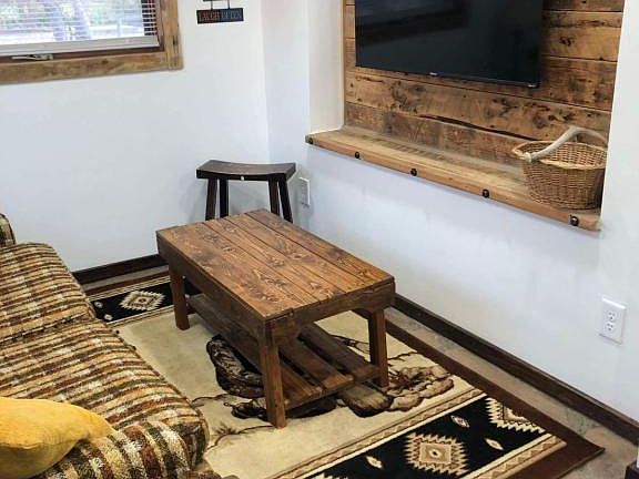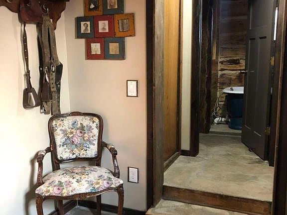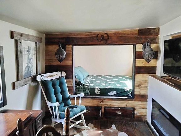 Interior includes rustic designs - from hand carved stone flooring to wooden wall features and Western art. Open concept living room with a pullout couch and a dining room with a cute breakfast nook straddle a fireplace that wraps around to a farmhouse kitchen, which includes refrigerator, gas stove, and microwave/air fryer. Each decorated bedroom room has its own electric fireplace and inset television. A beautiful bathroom with separate shower and freestanding bathtub, and separate washer/dryer room, is set behind a Western themed Victorian bar with a gas fireplace. Back yard, off street parking for 1 car and plenty of street parking set among wonderful neighbors.