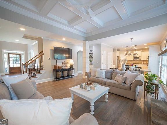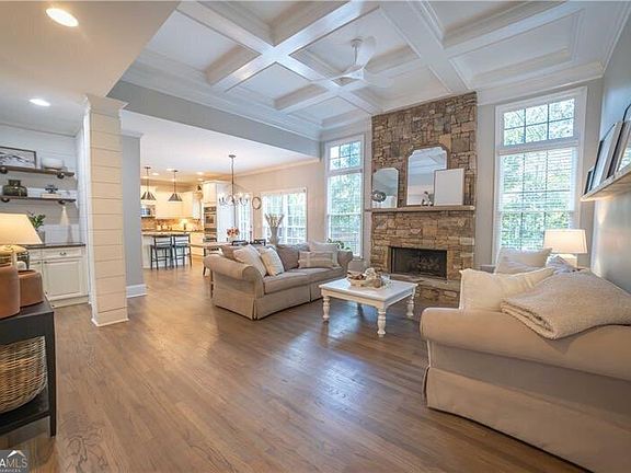 Curated Craftsman Style Perfection in River Green! This stunning 5-bedroom, 4-bath home with a 3-car garage and rocking chair front porch offers timeless elegance with a coastal chic interior, perfectly updated for modern living in one of the area's most sought-after communities. From the moment you enter the grand foyer-with its detailed millwork, cathedral ceiling, sweeping staircase, and real hardwood floors throughout the main level-you'll feel the light, bright, and effortlessly stylish design. The open-concept family room makes a statement with its dramatic coffered ceiling, cozy fireplace, and abundant natural light. The Family room flows seamlessly into an updated kitchen featuring designer lighting, granite counters, designer walk-in pantry, and ample cabinetry. A formal dining room and versatile living room/study with glass doors and transoms complete the perfect main-level layout for both everyday living and entertaining. A bedroom, walk-in closet, and full bath on this level add convenience and flexibility for guests or multigenerational living. Upstairs, the oversized primary suite is a true retreat with a trey ceiling, private sitting area, and spa-inspired bath boasting a freestanding soaking tub, oversized glass shower, dual vanities, and a custom-designed walk-in closet. Secondary bedrooms include walk-in closets and ensuite or shared baths, while a spacious bonus room offers extra space for play, media, or office needs. Step outside to your private backyard haven-complete with a deck, professionally designed hardscape, and fire pit ideal for gatherings. The full unfinished basement includes a workshop and fitness center, offering endless possibilities for expansion. With updated lighting and fixtures throughout, this home is move-in ready, polished to perfection, and styled with an elegant coastal flair. All of this is in prestigious River Green, one of Cherokee County's most desirable communities, offering a second pool at the Summer Club, six lighted tennis courts, soccer and playfields, children's playgrounds, more than 200 acres of green space, and miles of trails leading to the beautiful Etowah River. Enjoy close proximity to vibrant Downtown Canton, lively Downtown Woodstock, Northside Cherokee Hospital, the Canton YMCA, scenic parks, top restaurants, shopping, and great schools. Additional highlights include a freshly painted exterior, newer roof, HVAC, brand-new hot water heater, and new carpet in select rooms. Cherokee homeowners age 62+ who have lived in the county for 5+ years also benefit from Cherokee County's School Tax Exemption.