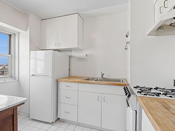 Unlike many units in the building, there are hardwood floors throughout, including the staircase. The living room has a wall of windows and space enough for dining and conversation areas plus additional storage beneath the stairs. This lower level also has a windowed kitchen with white cabinetry and butcher block counters. With a few upgrades, this could be a gem of a kitchen.