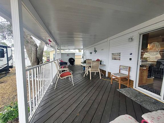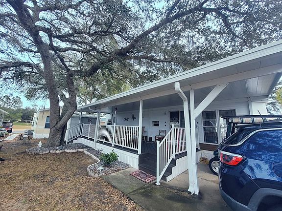 What a great Park Model to spend a little or a lot of time here. The covered deck is a stand out and the shade tree is wonderful fir summer time shade. Add an on-site washer dryer set up in the plenty large outbuilding and you have your own mini paradise. Ample parking. This one has a private bedroom at the back of the Unit and then a bonus room at the front of the Unit that could b a craft area, a guest quarters or even an office area. The Kitchen has the natural wood look and the breakfast area is just right for quick meals indoors. The outdoor covered deck is the perfect meeting place for friends! Remember this park is kept safer because resident approval is a must. This is also not a 55+ only community. Happy life starts right here! Golf carts, bicycles, and a pet friendly community is the tasty icing on this piece of Paradise. Mosey over to the driving range or choose from one of the many restuarants by the Villages.