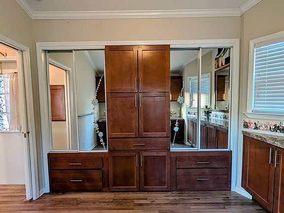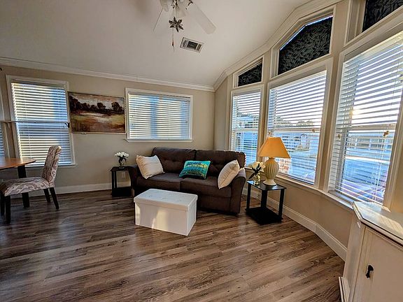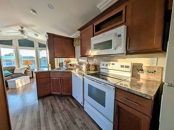 This is a one owner 2019 Park Model with many custom add ons. The kitchen has a dishwasher, microwave, corner sinks, smooth top stove and upgraded custom cabinetry. Upgraded flooring, Built in cabinets in the primary bedroom, double mirrored closets and a dual dresser. The bathroom has a walk in shower with glass doors and curved counter top. The stack washer dryer is the big bonus here. The back yard is perfect for your playful pet that needs room to run and the storage building offers plenty of off season storage room. There is double wide parking at the front of the Unit for vehicles or golf carts. A great Unit at a great price!