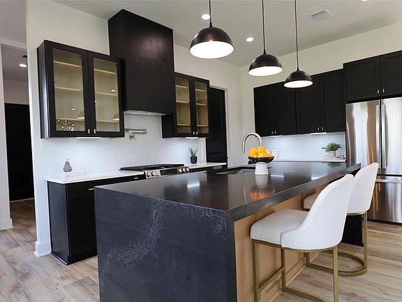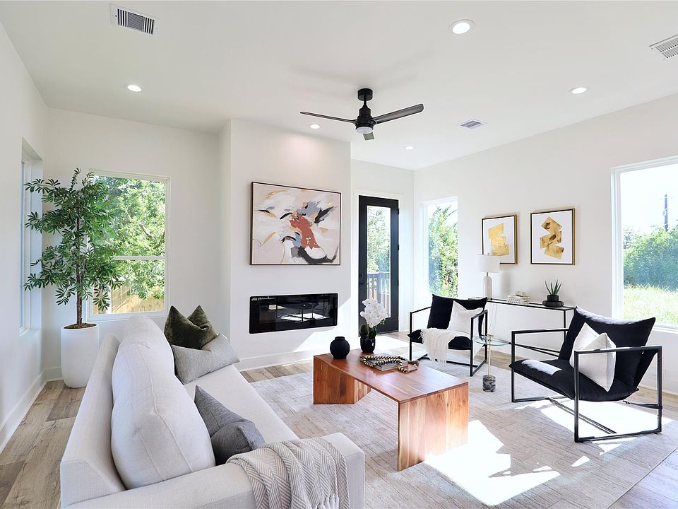Bold design meets effortless living in this 3-bedroom, 2.5-bath home, where luxury touches every room. With app-controlled comfort, Pannu Homes redefines smart living just minutes from vibrant Houston Heights. A bright living room welcomes you with large windows and an electric fireplace. The chef-inspired kitchen features sleek soft-close cabinetry with 10-inch handles, a pot filler, built-in spice rack and trash bin, and a waterfall island. Under-cabinet lighting and a walk-in pantry add both style and function. Ascend the grand staircase, where stair-step lighting, a 35-ft accent wall, and a radiant chandelier make a bold statement. Upstairs, the serene primary suite offers a private balcony, a cozy nook for reading or remote work, and a custom walk-in closet. The spa-like ensuite features floor-to-ceiling tile, rainfall and handheld showerheads+spacious linen closet.2 additional bedrooms share a Jack and Jill bath, while a chic powder room completes the main floor.