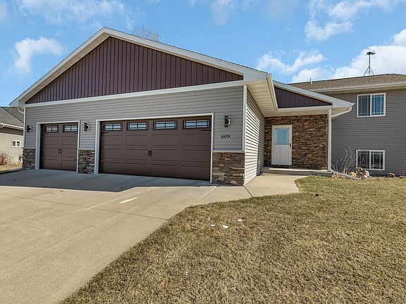 The exterior of the home combines vinyl siding with stone accents and vertical shiplap siding, adding a touch of character and style. A storm door on the front entry ensures protection from the elements while offering an inviting entrance. Inside, the heated and insulated garage provides a comfortable space for year-round use, with both overhead garage doors featuring their own openers that can be controlled via a smartphone app. A convenient service door leads out to the backyard and patio for easy access.