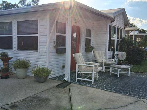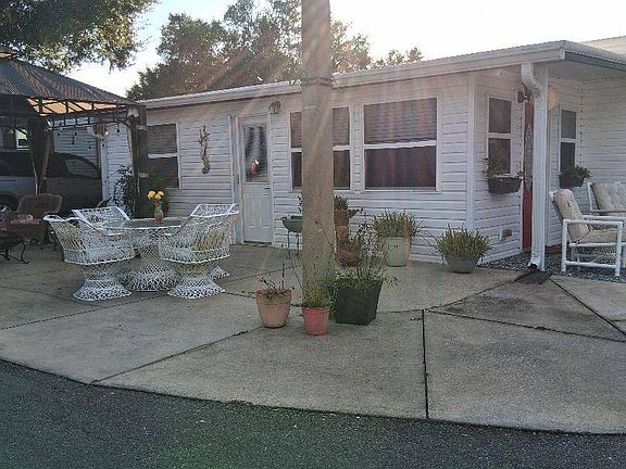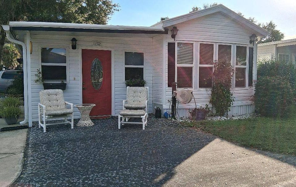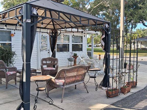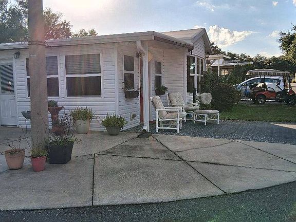 HONEY STOP THE CAR! Don't wait another minute to call about this beautiful, fully furnished, move-in ready corner lot! This charming 1990 Park Model offers 1 bedroom 1 bath and nearly 800 square feet of eye pleasing comfortable living. The eat-in kitchen features black appliances, a moveable island, generous cabinetry and a spacious pantry. The bedroom includes built-in cabinets and a lift-up mattress revealing deep hidden storage. Wait until you step into the updated bathroom complete with a walk-in shower, built-in shower seat and 8 invigorating shower jets...your personal spa retreat! An additional 12 x 15 living room boasts vinyl plank flooring, a propane fireplace and access to an outside seating area that doubles as additional parking or the perfect spot to waive at friendly neighbors. A 12 x 12 Den/Office (Bonus Room) with ceramic tile flooring offers endless possibilities...craft room, reading nook or hobby room. The main driveway accommodates 2 vehicles, and the side patio includes comfortable wicker furniture for relaxed socializing. A 6 x 8 Utility Shed houses a washer and dryer with electricity and shelving, providing plenty of room for any tools and accessories. Recent updates include 2023 A/C system that has been annually maintained for peace of mind. Lot rent includes Wi-Fi, cable, trash and water. This welcoming adult community offers a vibrant lifestyle with 3 clubhouses, 14 Pickleball Courts, 8 Shuffleboard Courts, Fitness Room, On-Site Post and a large and small Dog Park. The Villages--known for its entertainment, dining, shopping and other events is just minutes away and you're only 1.5 hours away for either coast. So, what are you waiting for? The sooner you make that call, the sooner you will be living your new Florida lifestyle in Recreation Plantation. You will be so glad you stopped the car, honey!