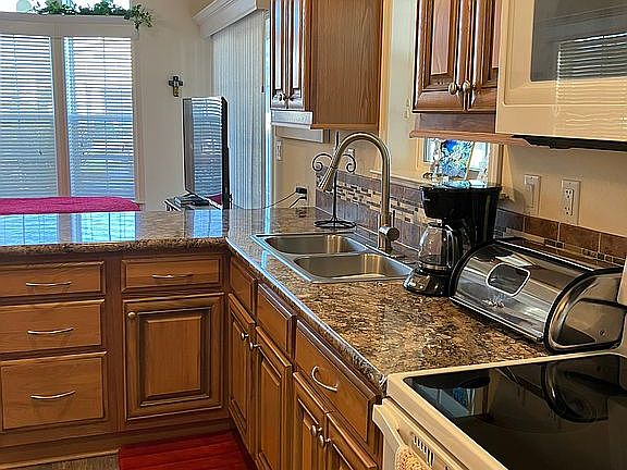 Immaculate manufactured home with major furniture including two electric beds, washer and dryer, solid oak dining set, covered carport, covered patio, two sheds, luxury vinyl plank flooring throughout, two bay windows, recessed lighting, trayed ceilings, bullnose corner drywall throughout, stone wall landscaping.