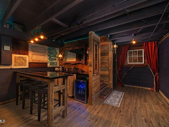 The main living area features soaring ceilings that create an impressive sense of space and natural light, offering the perfect setting for a twelve foot Christmas tree during the holiday season. This home offers three distinct living and entertaining spaces including the living room, a separate den and the newly finished speakeasy space in the basement, which is a sophisticated entertaining space with moody, atmospheric elements that are perfect for hosting friends or enjoying a quiet evening.